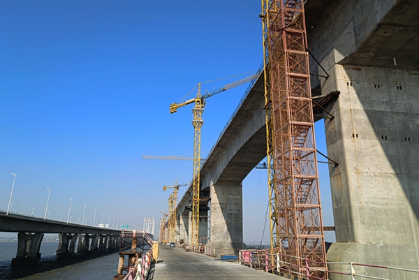 泉州灣海域風(fēng)大浪急,水域復(fù)雜,橋墩施工是此次建設(shè)中的難點(diǎn)。按照施工要求,在主墩的建設(shè)中,福建開輝公司共投入4臺塔機(jī),頂升最終高度達(dá)168米。由于海面高空作業(yè),塔身晃動非常大,為塔機(jī)標(biāo)準(zhǔn)節(jié)的加降帶來極大困難。現(xiàn)場技術(shù)人員針對這些特殊情況,采取防范措施,增加塔機(jī)與橋墩附著道數(shù),最密集的地方兩個標(biāo)準(zhǔn)節(jié)就要做一道附著,有效解決了超高塔機(jī)安全施工難題。安拆及維修人員憑借嫻熟精湛的技術(shù)和扎根于內(nèi)心深處的安全意識,各方溝通協(xié)調(diào),各個環(huán)節(jié)緊密有序配合,最終圓滿完成了各類挑戰(zhàn)。