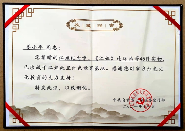 在“紅巖英烈”江姐犧牲72周年紀(jì)念日前夕,姜小平向自貢市江姐故里紅色教育基地?zé)o償捐贈了45件與江姐相關(guān)的文獻史料,讓藏品發(fā)揮應(yīng)有價值,讓紅巖精神代代相傳。
