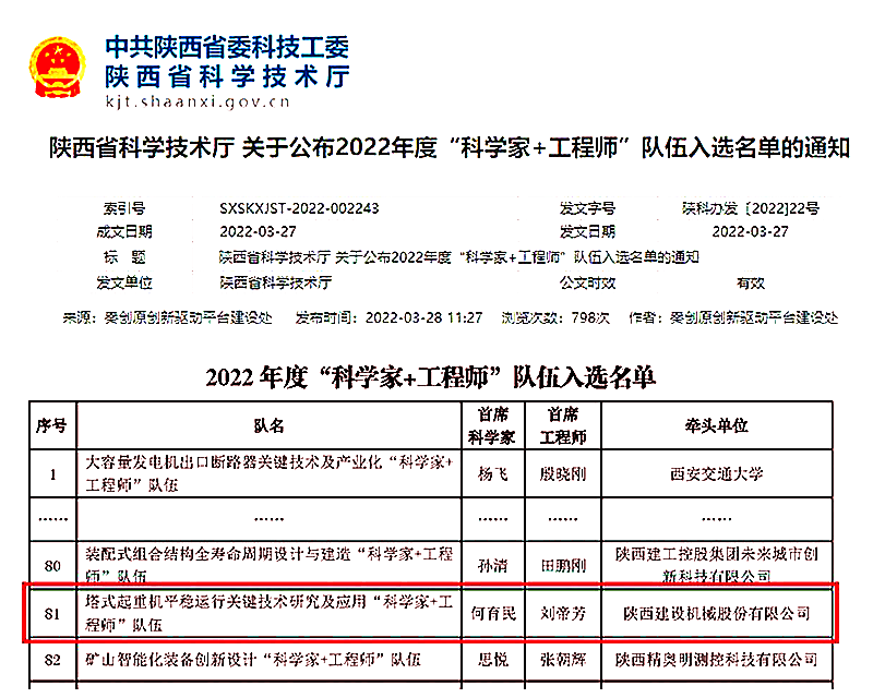 陜建機(jī)股份校企聯(lián)合研發(fā)團(tuán)隊(duì)入選陜西省2022年度“科學(xué)家+工程師”隊(duì)伍