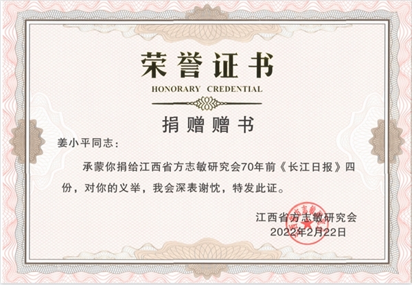 2月22日,陜建機(jī)股份公司職工姜小平收到了江西省方志敏研究會(huì)頒發(fā)的捐贈(zèng)證書,感謝他慷慨捐贈(zèng)4份70多年前《長江日?qǐng)?bào)》的原版報(bào)紙,這些珍貴的史料再現(xiàn)了“方志敏同志戰(zhàn)斗的一生”。“敵人只能砍下我的頭顱,決不能動(dòng)搖我的意志!”“朋友,我相信,到那時(shí),到處都是活躍的創(chuàng)造,到處都是日新月異的進(jìn)步……”1935年,方志敏同志被捕后面對(duì)國民黨反動(dòng)派威逼利誘,在獄中寫下鏗鏘誓言以及對(duì)未來美好中國的期盼。今天讀來,我們?nèi)匀粸橹畡?dòng)容,深刻感受到老一輩共產(chǎn)黨人為了革命理想不懼任何犧牲的豪邁情懷。2022年1月21日,21歲的方瀚輝(方志敏曾孫...